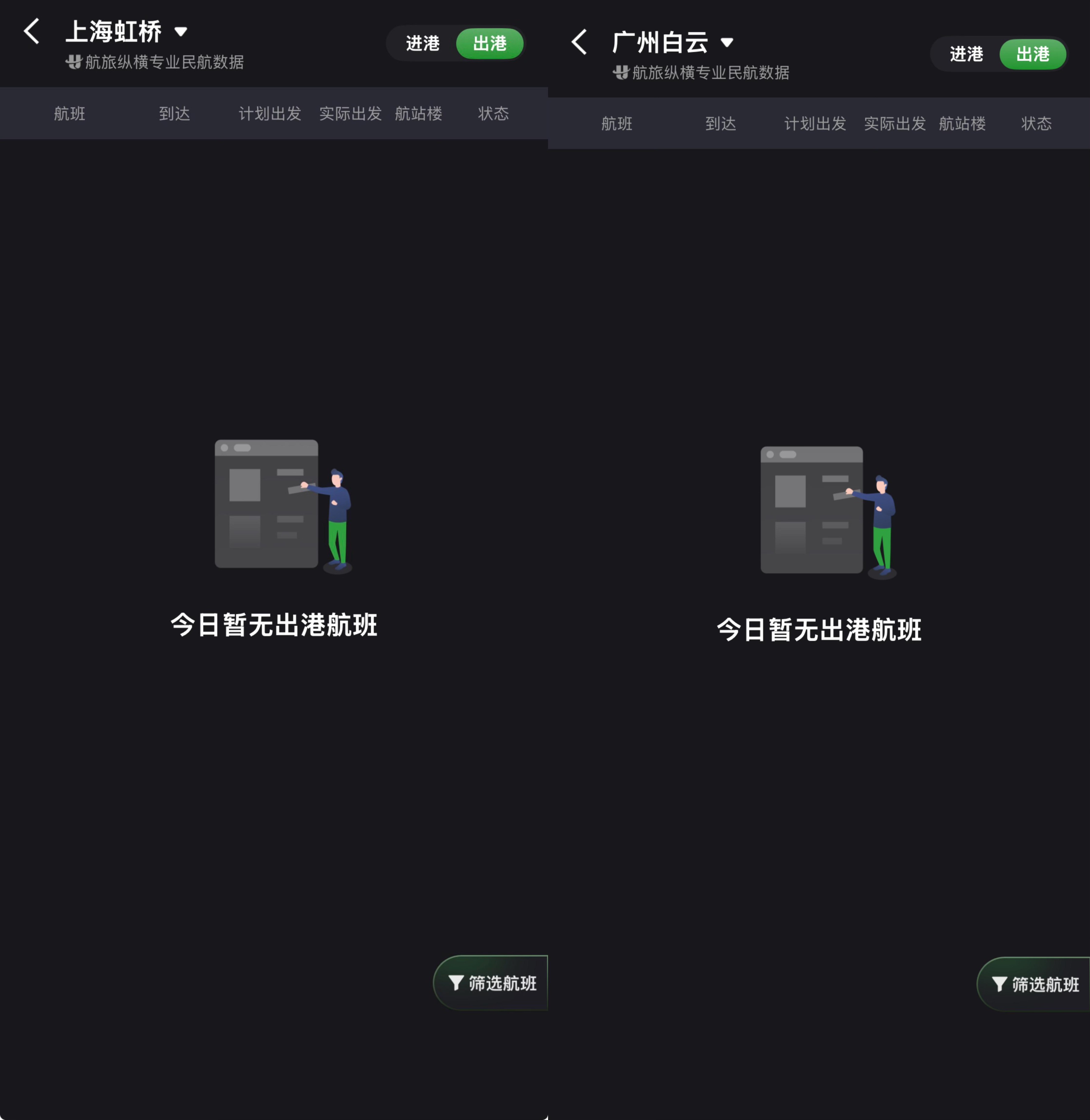 此外,通过航旅纵横查询上海虹桥机场、广州白云机场的进、出港情况,页面显示“暂无航班”。