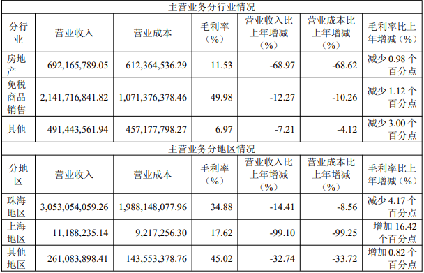 分地区来看,公司上海地区实现营业收入0.11亿元,同比减少99.10%;营业成本0.09亿元,同比减少99.25%。其他地区实现营业收入2.61亿元,同比减少32.74%;营业成本1.44亿元,同比减少33.72%。主要系因上年公司重大资产置换实施完成,置出非珠海区域5家房地产子公司100%股权所致。