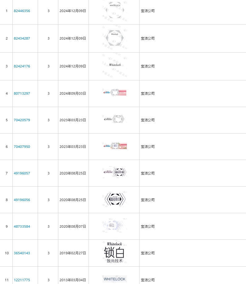 佳洁士“锁白”系列牙膏,也有类似现象。“锁白”系列牙膏上的“WHITELOCK”同样带有“TM”标志。国家知识产权局商标局官网信息显示,宝洁公司就不同样式的“锁白”“WHITELOCK”进行申请注册,一些样式已注册成功,一些则处于初审或无效状态。