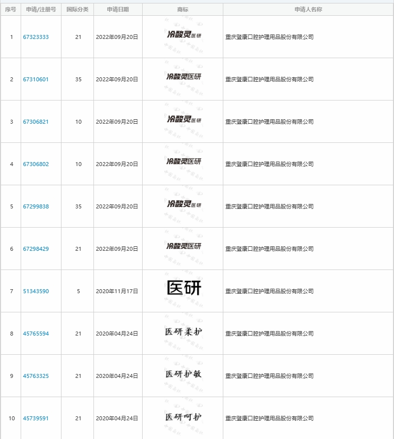 记者查询发现,冷酸灵品牌所属的重庆登康口腔护理用品股份有限公司(简称“登康口腔”)申请注册了多个不同样式含“医研”字样的商标,包括“冷酸灵医研”“医研护敏”“医研”等。