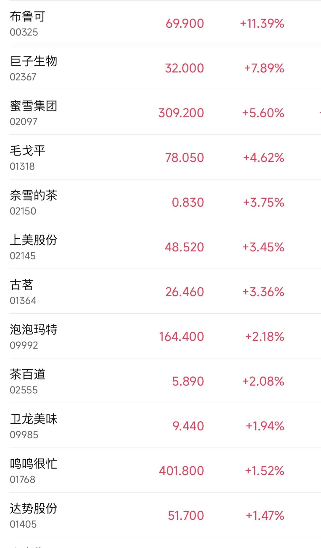 4月21日,港股新消费股火热,多只茶饮股走高。蜜雪集团涨超6%,沪上阿姨盘中一度涨超17%,收涨14.87%,奈雪的茶、古茗、茶百道跟涨。此外,布鲁可涨超11%,巨子生物涨近8%,毛戈平涨超4%,泡泡玛特涨超2%。