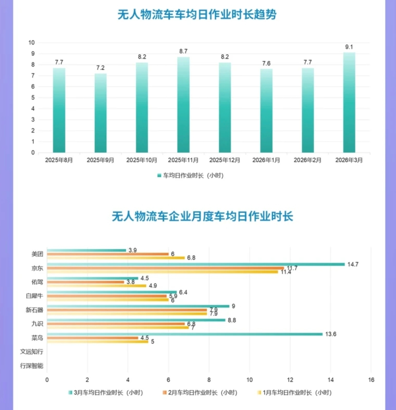 数据显示,3月,深圳无人物流车车均日作业时长首次提升到9小时以上,环比增长8%。