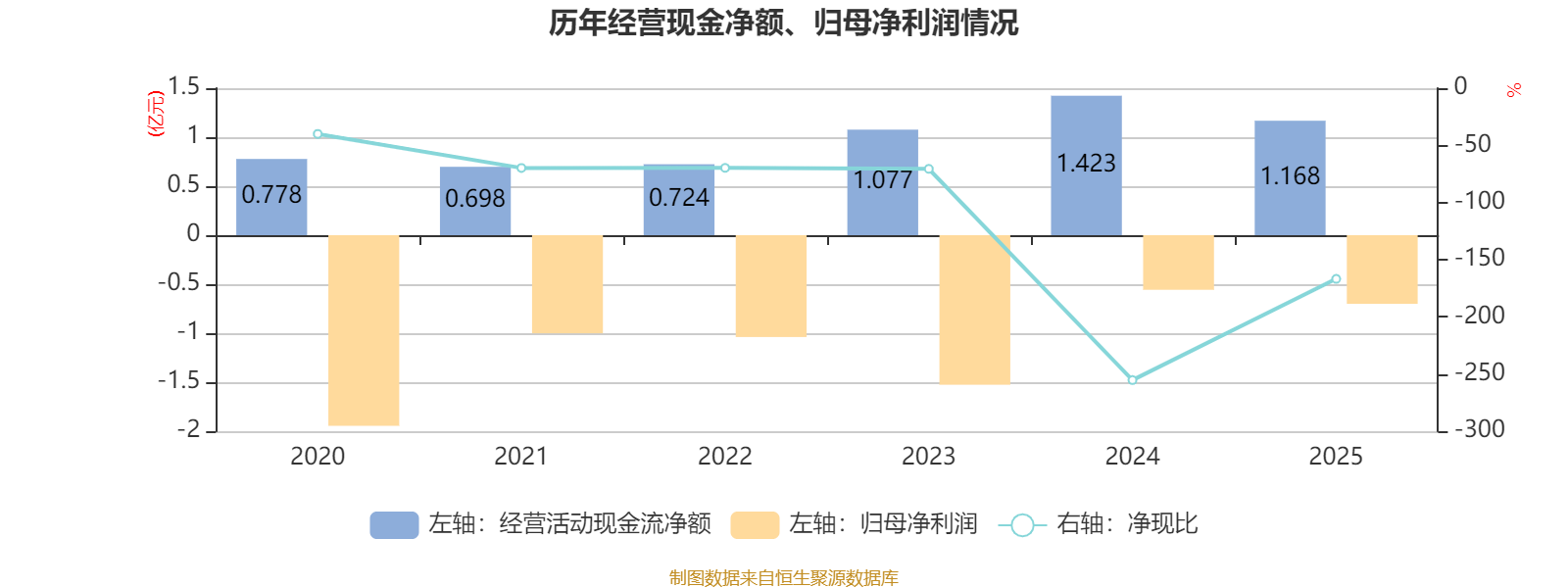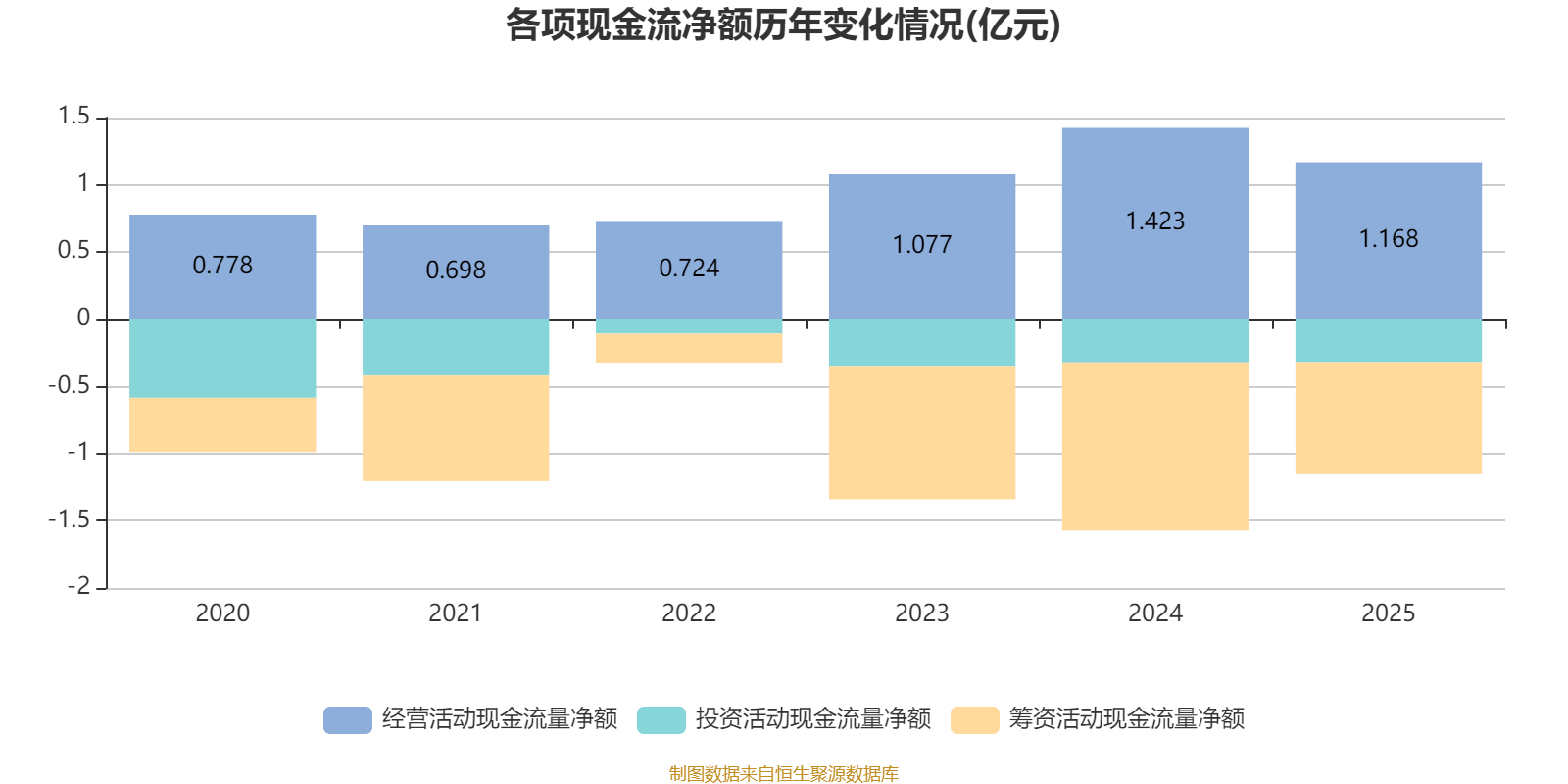 2025年,公司经营活动现金流净额为1.17亿元,同比下降17.94%;筹资活动现金流净额-8344.9万元,同比增加4161.5万元;投资活动现金流净额-3187.6万元,上年同期为-3213.3万元。