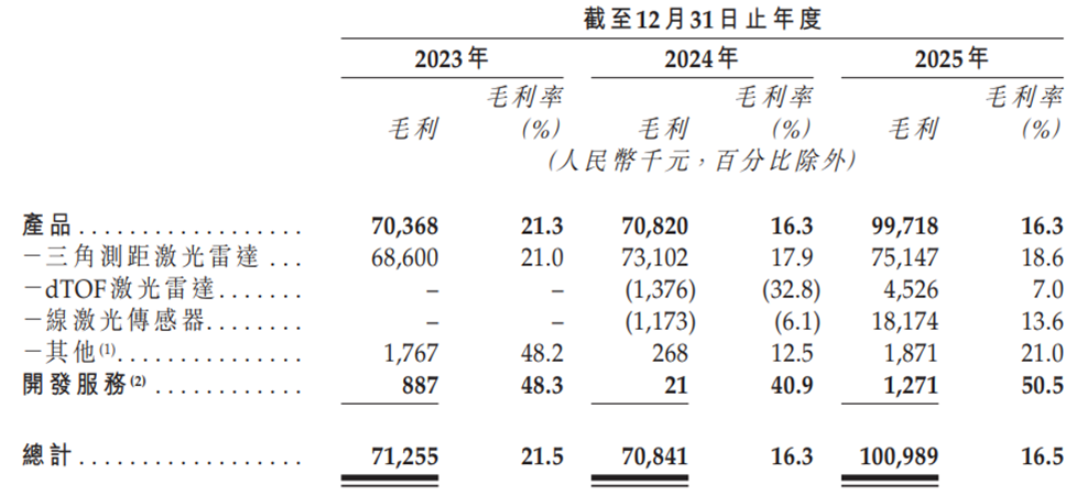 毛利率的下滑,主要源于两个方面:一是核心产品三角测距激光雷达的价格竞争加剧,公司为抢占市场份额被迫让利,导致该产品毛利率从2023年的21.0%小幅波动至2025年的18.6%;二是新推出的dTOF激光雷达和线激光传感器产品,在2024年处于亏损状态,拉低了整体盈利水平。
