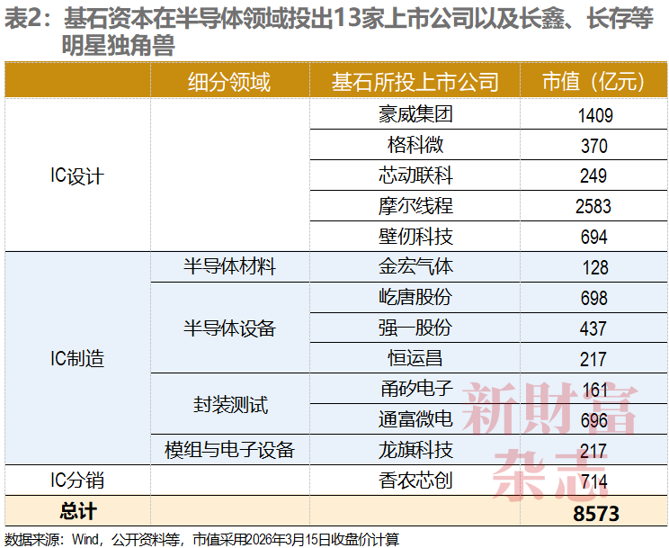 据《新财富》杂志不完全统计,截至2026年3月15日,基石资本在重点布局的AI、半导体、智慧汽车与机器人、商业航天、生命科学与健康等几大赛道上,合计投出了57家上市公司,它们的总市值达到2.1万亿元。再加上长鑫科技、长江存储、智元机器人、立景创新、歌尔微、蓝箭航天等知名独角兽,基石资本的被投企业朋友圈估值接近4万亿元。