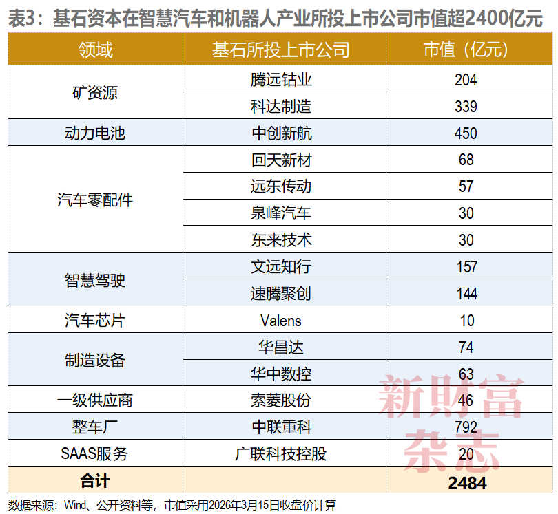在智慧汽车和机器人板块,基石资本合计投资了15家上市公司,其总市值达2484亿元,包括450亿元市值的中创新航(03931.HK),以及市值792亿元、定增入股的中联重科(000157)等(表3)。