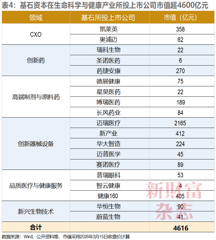 在生命科学与健康产业,基石资本投资了19家上市公司,板块市值达4616亿元,包括2165亿元市值、从美股私有化回归A股时进入的迈瑞医疗(300760),也包括412亿元市值的新产业(300832)、358亿元的凯莱英(002821)、270亿元的药捷安康(02617.HK)、224亿元的华大智造(688114)等(表4)。