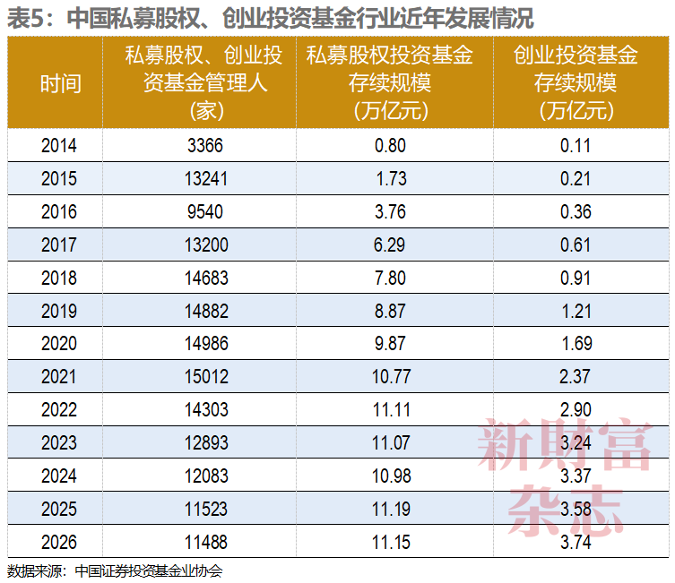 事实上,同一时期,基石资本所处的私募行业,因外部压力加大、内部困难增多,机构数量缩减,发展节奏放缓。中国证券投资基金业协会的数据显示,2021年末,国内私募股权、创业投资基金管理人有15012家,管理的基金规模为13.14万亿元;到2025年末,这两项指标分别为11523家、14.77万亿元(表5)。