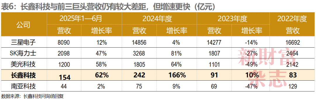 芯片领域国产替代的加速,使得长鑫近年的业绩成长性持续领先友商。2024年,其营收增速高达166%,而同期SK海力士、美光科技、三星电子的营收增速仅为81%、64%、4%。2025年,由于AI的推动,存力紧张,内存全面涨价,部分型号甚至跳涨10倍,长鑫营收预计将达到550亿一580亿元(表6)。