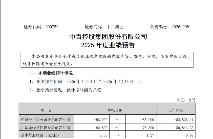 《每日经济新闻》记者注意到,中百集团2025年实际亏损额超出了此前预期。根据公司1月底发布的业绩预告,预计2025年归属于上市公司股东的净利润亏损8.5亿元至9.2亿元。而最终年报公告的9.57亿元亏损额,突破了预告上限。