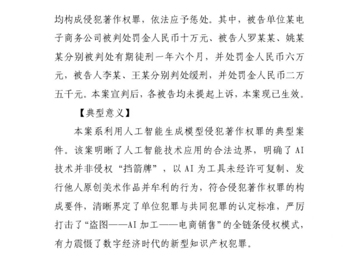 4月22日,北京市高级人民法院发布2025年度北京法院知识产权司法保护状况及典型案例。其中包括,涉利用人工智能生成模型侵犯著作权罪案。在阐述典型意义时,法院指出,本案明晰了人工智能技术应用的合法边界,明确了AI技术并非侵权“挡箭牌”。以AI为工具未经许可复制、发行他人原创美术作品并牟利的行为,符合侵犯著作权罪的构成要件。法院同时清晰界定了单位犯罪与共同犯罪的认定标准,严厉打击了“盗图—AI加工—电商销售”的全链条侵权模式,有力震慑了数字经济时代的新型知识产权犯罪。