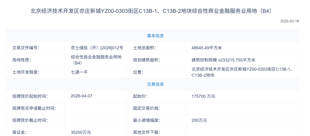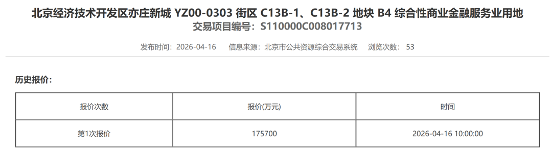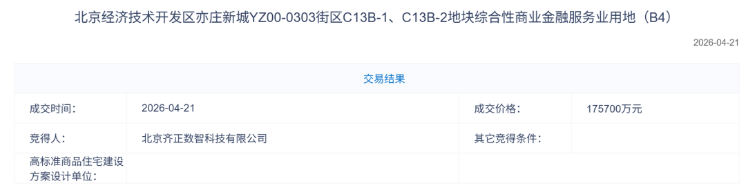 据北京市规划和自然资源委员会官网公示信息,北京齐正数智科技有限公司以17.57亿元的价格,获得北京经济技术开发区亦庄新城YZ00-0303 街区C13B-1、C13B-2地块综合性商业金融服务业用地(B4)。
