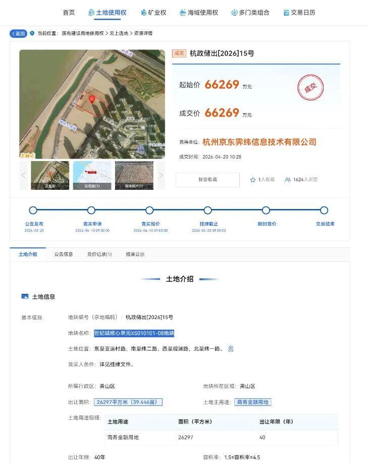 4月20日上午,浙江省自然资源网上交易中心公布,位于杭州钱江世纪城核心区的一宗沿江商业用地挂牌出让,杭州京东霁纬信息技术有限公司以约6.63亿元底价竞得杭政储出〔2026〕15号地块(世纪城核心单元XS010101-08地块)。