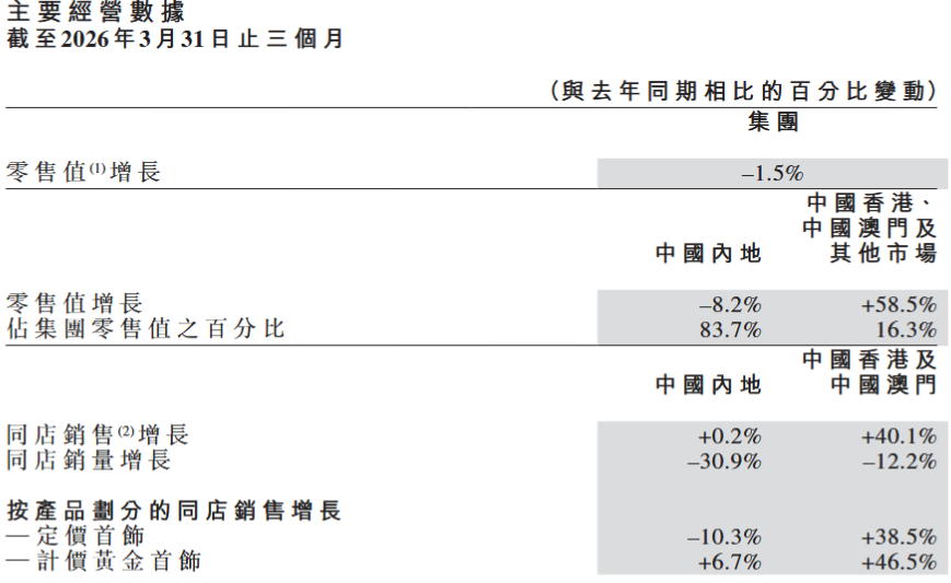 公告中提到,2026年第一季度,中国内地的定价首饰零售值占比提升至36.2%,而计价黄金首饰的占比下降至61.1%。此外,公司一季度