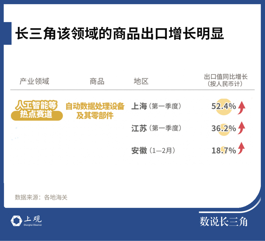 数据是人工智能产业的核心命脉,一季度,上海口岸自动数据处理设备及其零部件出口增速明显,同比增长超50%。AI算力需求爆发正在成为新的出口增长极。浙江存储部件出口增长58.2%,江苏一季度中央处理部件增长13.9%。