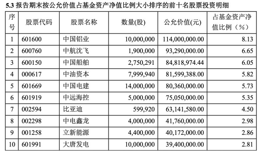 到了2026年一季度末,前十大重仓股则换成了中国铝业、中航沈飞、中国船舶、中油资本、中国电建、中远海控、比亚迪、中电鑫龙、立新能源、大唐发电。和去年年底相比,原有持仓大面积退出,新进组合则更偏向有色、军工、航运、电建、能源等方向。