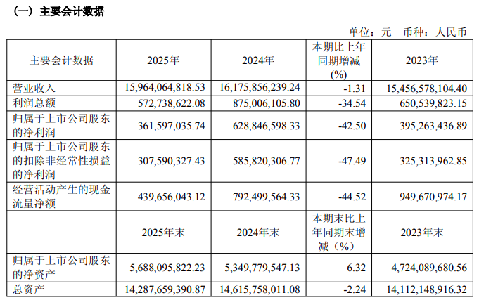 同日披露的2026年第一季度报告显示,公司实现营业总收入41.75亿元,同比微增0.02%,几乎陷入停滞;而归母净利润1.61亿元,同比下降24.33%,延续颓势;经营活动产生的现金流量净额为-1.86亿元,上年同期为-4.65亿元,虽然有所改善,但仍为负值。