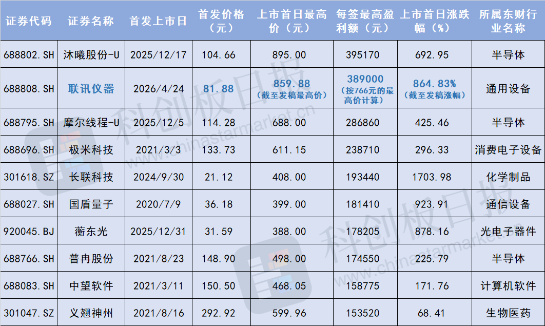 今日,光芯片测试设备厂商联讯仪器(688808.SH)正式登陆科创板,上市首日开盘价报736.92元/股,截至发稿,涨幅达864.83%。以单签500股、81.88元/股的发行价、上午盘中最高价859.88元/股计算,中一签赚38.9万元。