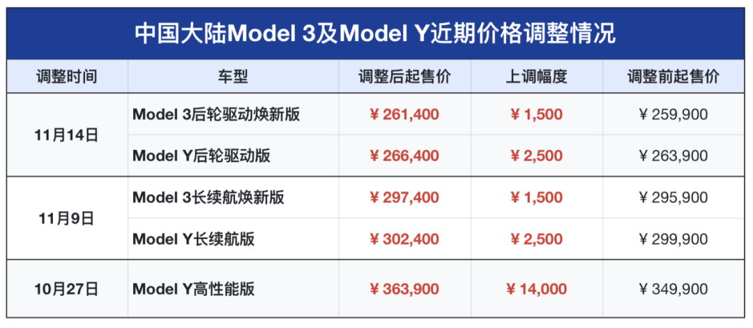 11月14日,特斯拉中国宣布即日起上调Model 3/Y后轮驱动版售价,Model 3后轮驱动版涨价1500元至26.14万元,Model Y后轮驱动版涨价2500元至26.64万元。这是自10月27日以来,特斯拉在国内的第三次价格上调。短短19天内,特斯拉中国针对不同的车款完成了三次价格上调。