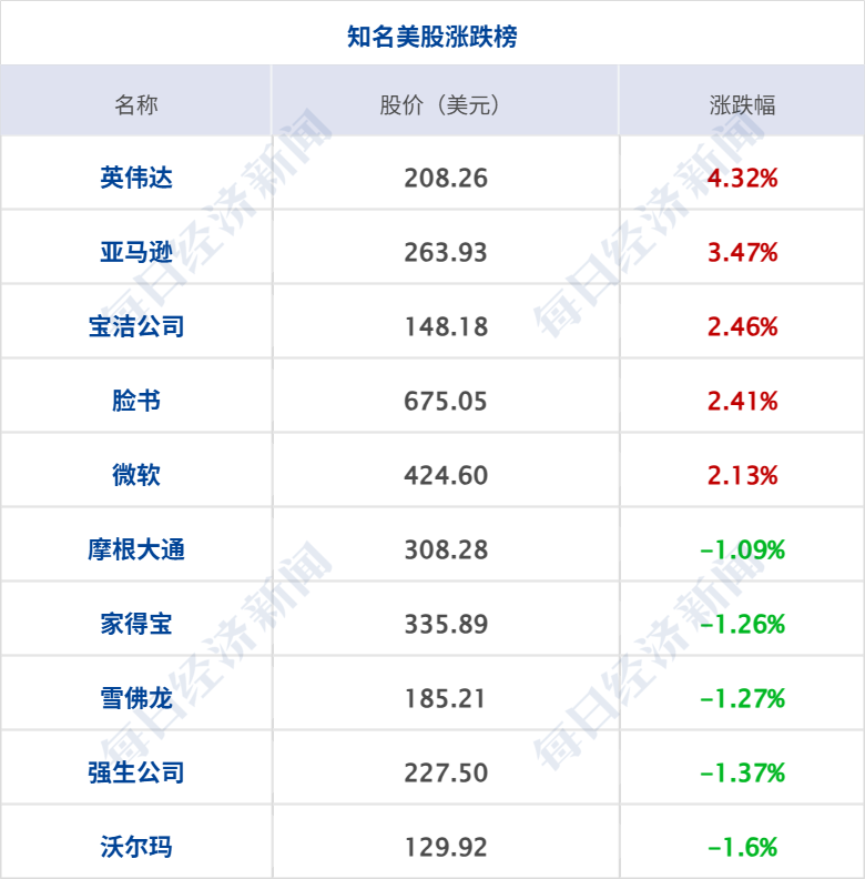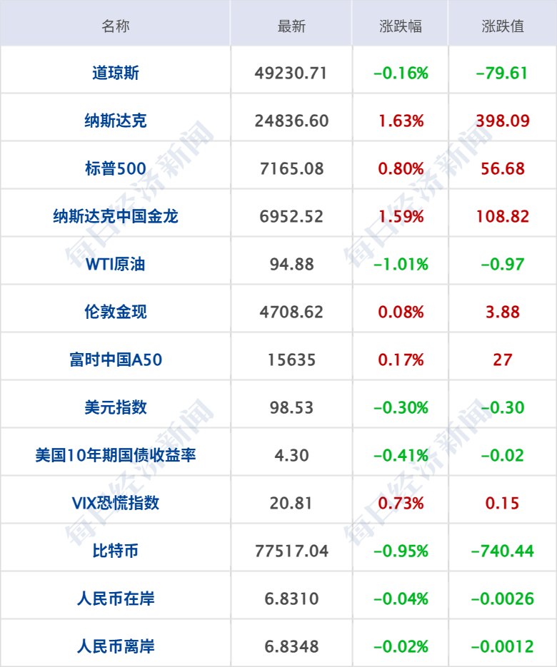 美股三大指数收盘涨跌不一,纳指涨1.63%,标普500指数涨0.8%,纳指、标普500指数双双再创新高,道指跌0.16%;热门科技股普涨,费城半导体指数涨4.32%,本周累计上涨10%,本月迄今上涨38.5%,英特尔涨超23%,英伟达涨超4%,股价自10月以来首次收盘创纪录新高,市值重新站上5万亿美元,亚马逊涨超3%,微软、Meta涨超2%,谷歌涨超1%,Arm涨超14%,AMD涨超13%,高通涨超11%,超微电脑涨超8%,美光科技涨超3%。中概股多数上涨,纳斯达克中国金龙指数涨1.59%,禾赛科技涨超6%,百度集团、老虎证券涨超5%,小鹏汽车、世纪互联涨逾4%,金山云跌超3%,理想汽车跌近3%。