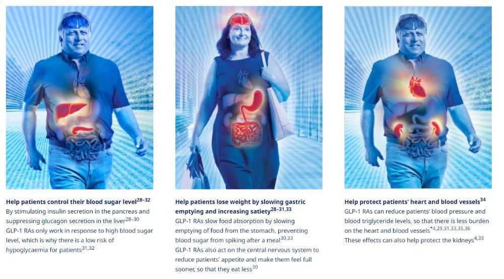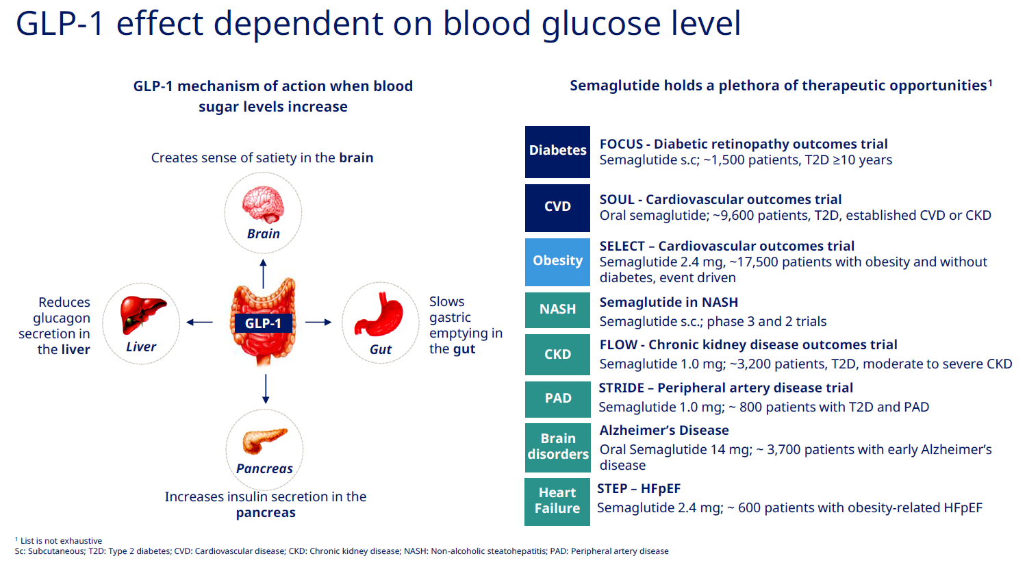 值得注意的是,诺和诺德在多个公开材料中都会展示一张不断更新的图表,展示了GLP-1在新适应症方面的系统性扩展,包括肝脏、脑、肠道和胰脏等多个领域。司美格鲁肽已逐步将多个大适应症纳入囊中。