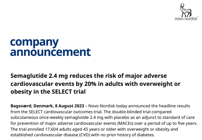此前,财联社在8月份的报道中提到,诺和诺德备受瞩目的III期试验“SELECT”的积极结果超出预期,暗示Wegovy在降低严重心血管疾病风险方面存在潜力。