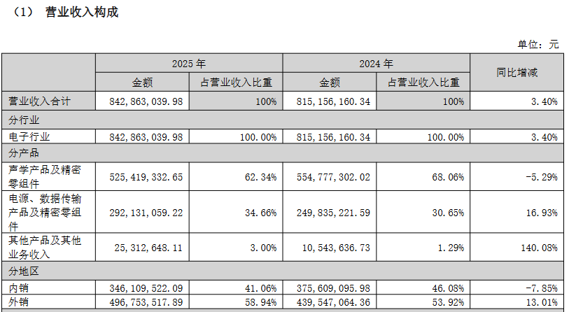 2025年,公司收入结构持续向核心主业收敛。声学产品及精密零组件实现收入5.26亿元,占总营收比重达62.34%,仍为第一大业务板块;电源、数据传输产品及精密零组件收入2.92亿元,占比34.66%,稳居第二。二者合计贡献97.00%的营业收入,主业聚焦度进一步提升。