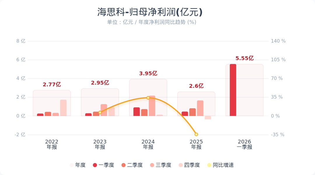 海思科(002653.SZ)公告称,2026年第一季度实现营业收入15.64亿元,同比增长75.33%;归属于上市公司股东的净利润为5.55亿元,同比增长1089.85%。业绩变动主要系本期转让HSK39004项目实现收入约5亿元所致。注:公司Q1净利润5.55亿,2025年Q4净利润-0.36亿,据此计算,Q1净利润环比扭亏为盈。