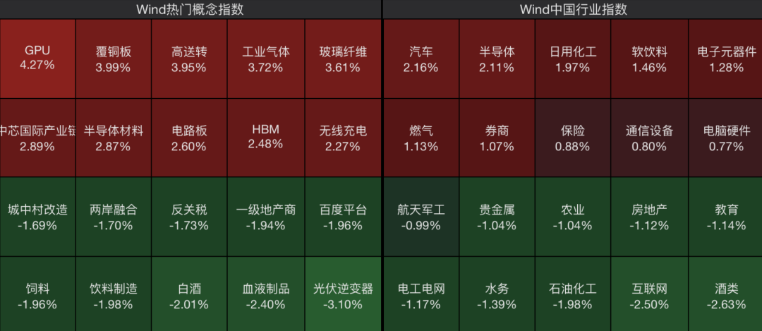 板块上来看,半导体板块集体走高,GPU、电子元器件、日用化工等板块表现活跃;而白酒、石油化工、电工电网等板块跌幅居前。