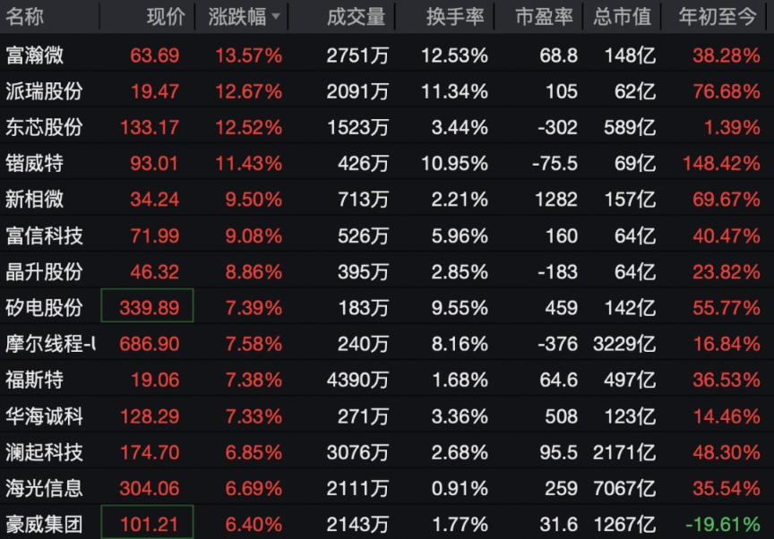 半导体板块集体走高,富瀚微、派瑞股份、东芯股份均涨超10%。