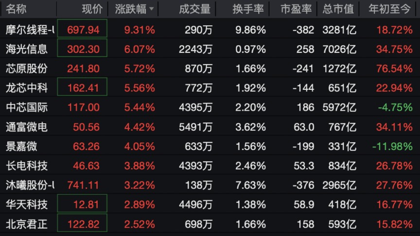GPU概念股表现活跃,摩尔线程涨超9%,海光信息、芯原股份、中芯国际等跟涨。