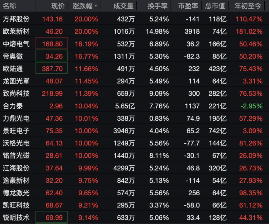 PCB、铜箔概念股多数走高,方邦股份、欧莱新材实现20%涨停,力鼎光电、沃格光电、景旺电子等多股涨停。此外,合力泰直线拉涨停,207万手封住涨停。
