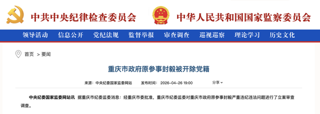 4月26日,中央纪委国家监委网站公告显示,据重庆市纪委监委消息:经重庆市委批准,重庆市纪委监委对重庆市政府原参事封毅严重违纪违法问题进行了立案审查调查。