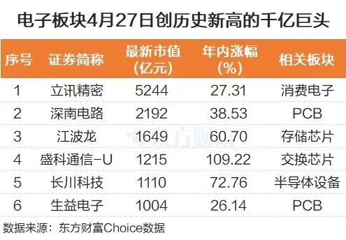 立讯精密(消费电子)、深南电路(PCB)、江波龙(存储芯片)、盛科通信(交换芯片)、长川科技(半导体设备)、生益电子(PCB)这6只千亿龙头再创历史新高。