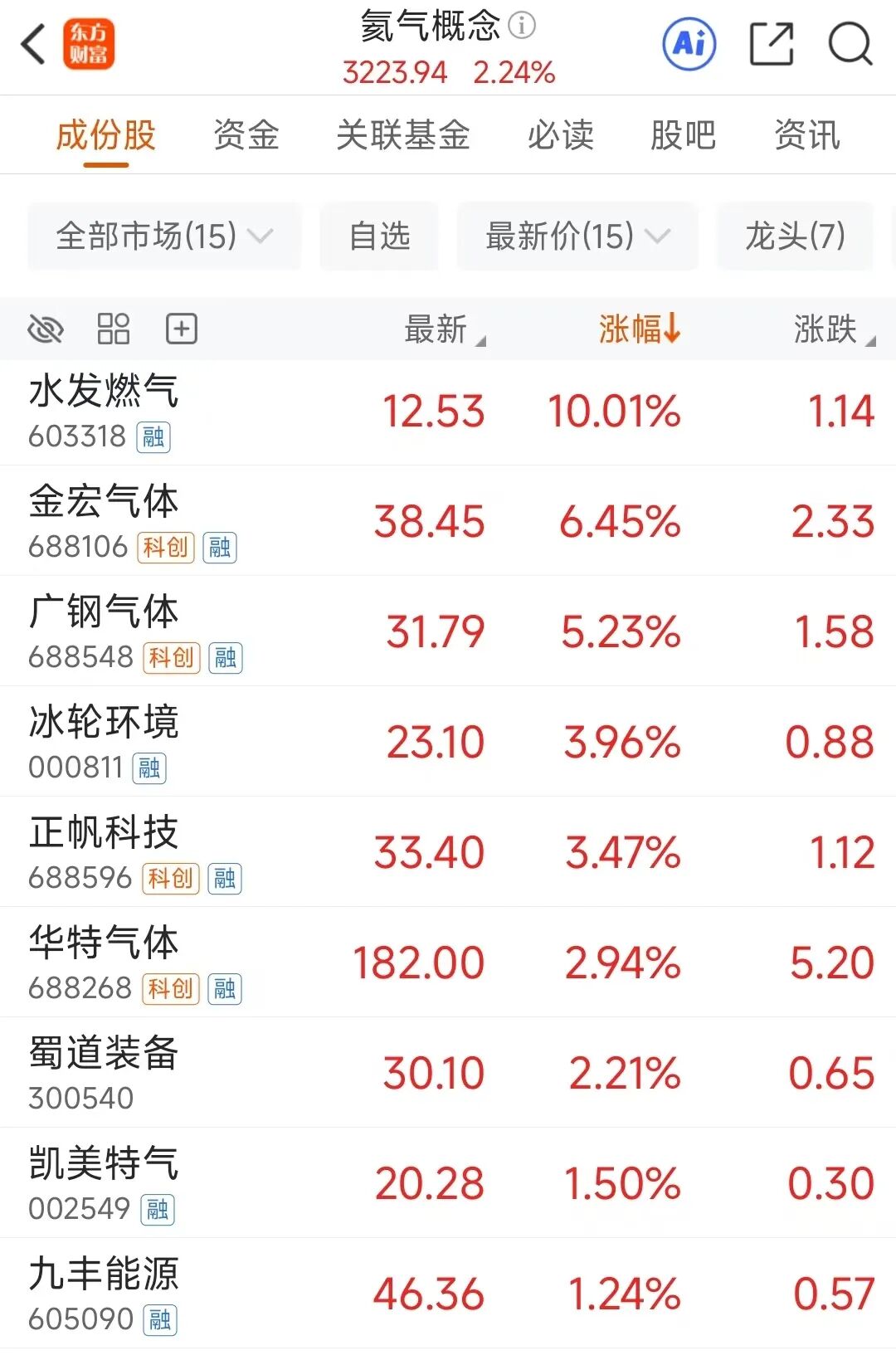 至于电子化学品,市场主要集中在以氦气为主的电子特气方向,水发燃气、金宏气体、广钢气体、华特气体等近几日股价明显拉升。