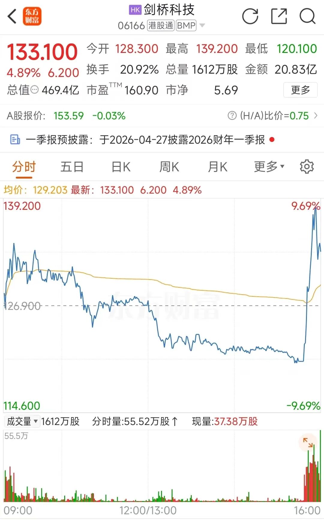 剑桥科技H股尾盘逆转狂飙