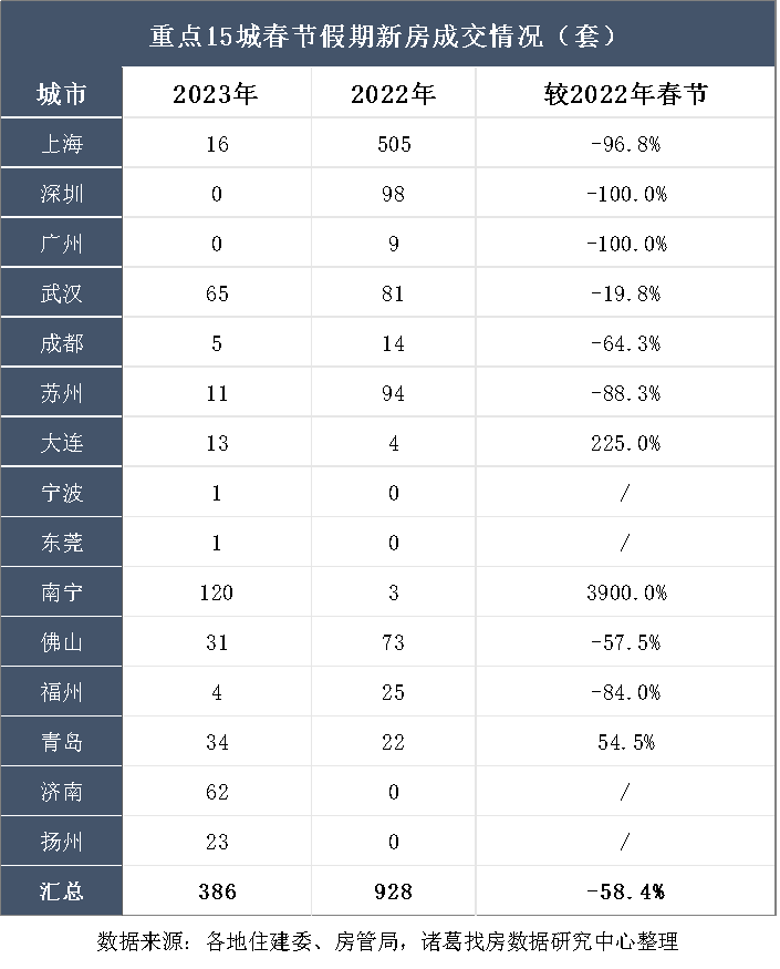 诸葛找房数据研究中心的数据也显示,2023年春节假期期间,重点15城新房成交386套,较2022年春节下降了58.4%。但值得注意的是,尽管整体成交有所下滑,但部分城市的返乡置业需求却有所增加。