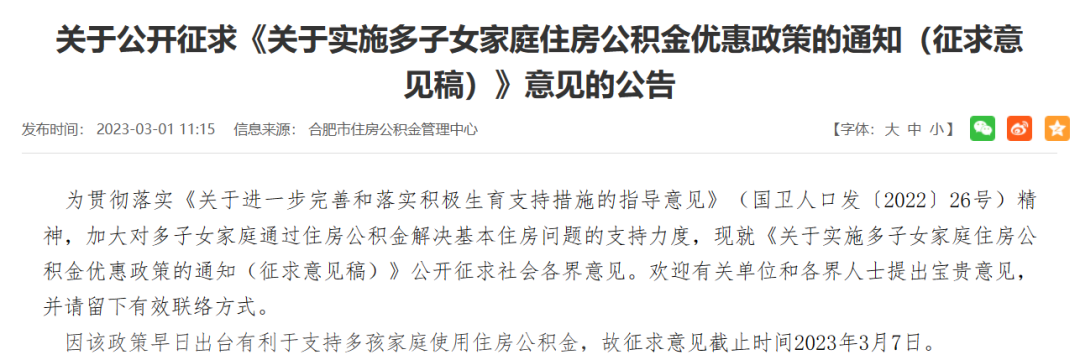 3月1日,安徽合肥率先行动,发布《关于实施多子女家庭住房公积金优惠政策的通知(征求意见稿)》。该政策提出,对于多子女家庭购买首套自住房且首次申请住房贷款的,单方最高可贷款额度将提高至65万元,夫妻双方则可达75万元。这一举措旨在通过住房公积金制度支持,解决多子女家庭的基本住房问题。