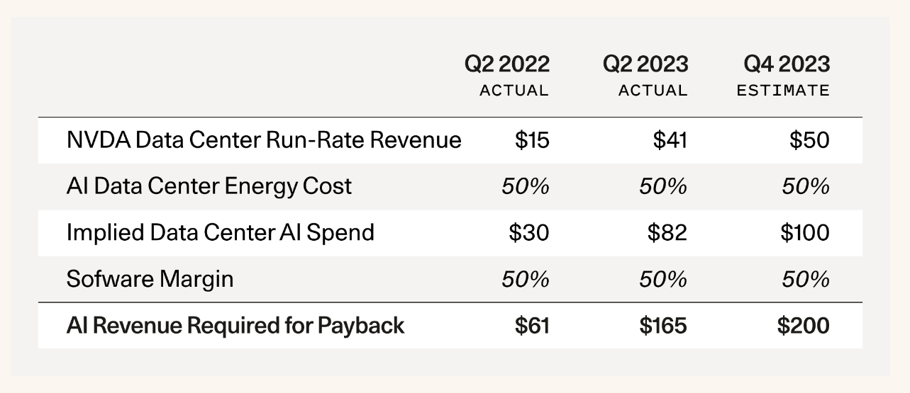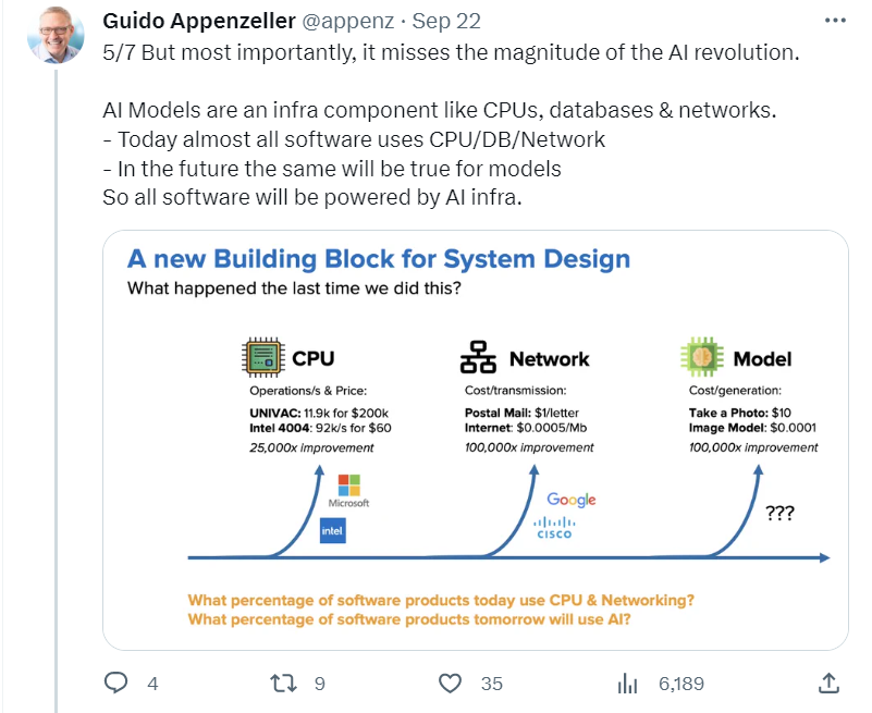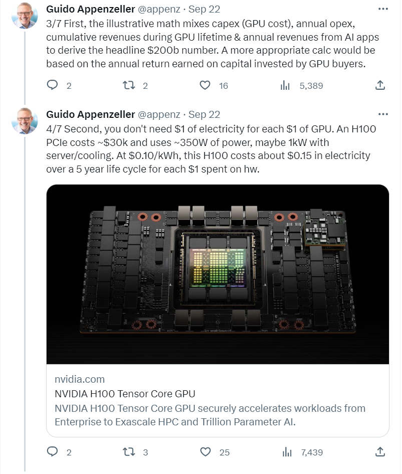 对于Cahn的观点,硅谷创投巨头A16Z的特别顾问、AI初创公司2X的创始人Guido Appenzeller提出了质疑和反驳。他逐字逐句地推翻了Cahn的论点,并提出了自己的见解。