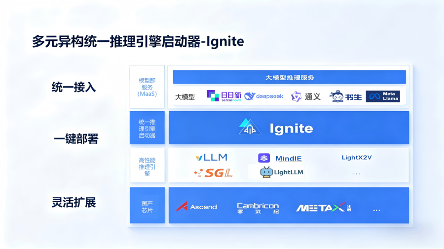 在推理侧,商汤大装置通过Ignite推理引擎启动器,兼容多模型与多引擎体系,通过提供统一API,并在KV Cache管理、多Token预测、算子优化、通信调优上形成全链路能力,实现“一键部署+自适配优化”,显著降低推理门槛。