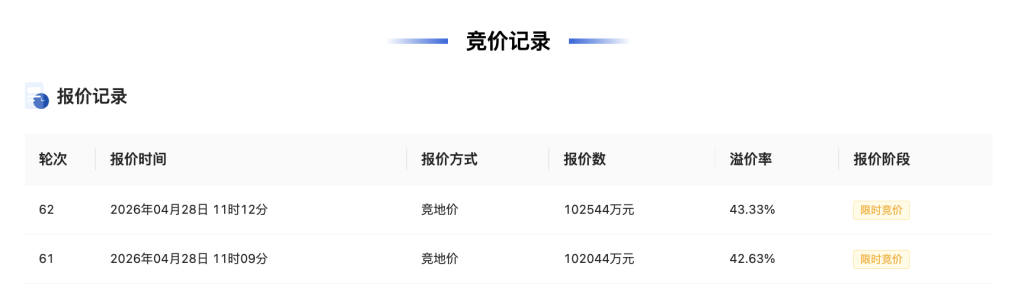 具体而言,位于余杭区良渚东单元YH030703-34地块为此次土拍中唯一高溢价地块。该地块编号杭政储出[2026]20号,地块四至为东至西塘路,南至九号支路,西至规划公园绿地,北至八号支路。用地性质为住宅用地,土地出让面积28278.00平方米,规划建筑面积62211.60平方米,容积率2.2,起始价7.15亿元,起始楼面价11500元/平方米。