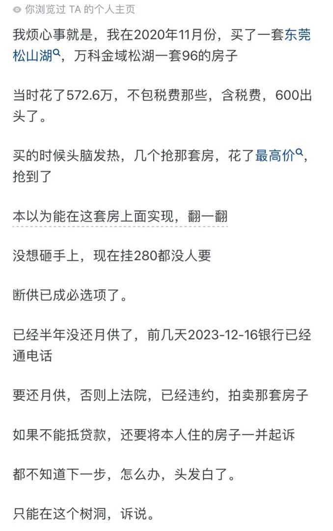 近日,一位网友在社交平台透露,其在2020年11月于东莞松山湖购买了一套96平方米的房子,总价572.6万元,含税费超过600万元。然而,由于经济压力,该网友已半年未还月供,面临银行起诉和房产拍卖的风险。