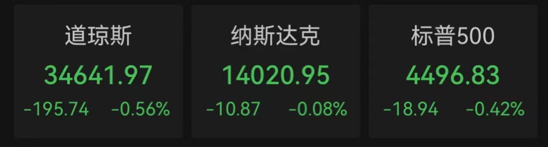 在美股市场,周二开盘后,三大指数持续走低。截至收盘,道琼斯工业平均指数下跌196点,跌幅0.56%,报收于34641.97点;标普500指数下跌19点,跌幅0.42%,报收于4496.83点;纳斯达克综合指数下跌11点,跌幅0.08%,报收于14020.95点。