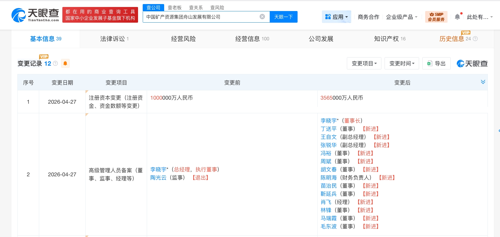 天眼查App显示,近日,中国矿产资源集团舟山发展有限公司发生工商变更,新增中国五矿集团有限公司、杭州钢铁集团有限公司、中远海运散货运输有限公司等为股东,注册资本由100亿元人民币增至356.5亿元人民币,增幅256.5%,同