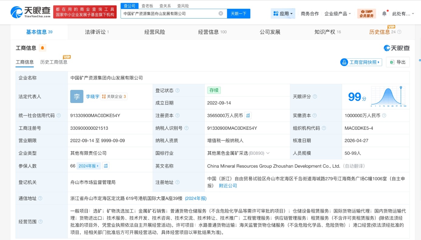 天眼查App显示,近日,中国矿产资源集团舟山发展有限公司发生工商变更,新增中国五矿集团有限公司、杭州钢铁集团有限公司、中远海运散货运输有限公司等为股东,注册资本由100亿元人民币增至356.5亿元人民币,增幅256.5%,同时,多位高管发生变更。中国矿产资源集团舟山发展有限公司成立于2022年9月,法定代表人为李晓宇,经营范围含选矿、矿物洗选加工、金属矿石销售、普通货物仓储服务、仓储设备租赁服务、国际货物运输代理、国内货物运输代理、货物进出口等。股东信息显示,该公司现由中国矿产资源集团有限公司及上述新增股东等共同持股。