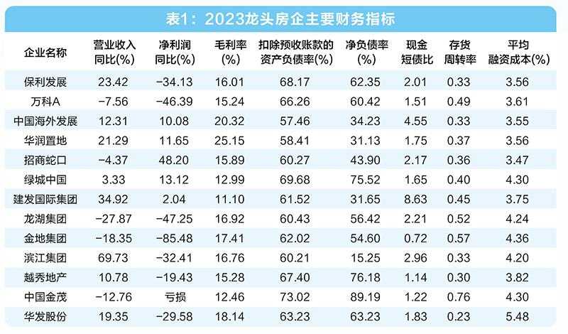 从负债端来看,房企在2023年首次压降了负债规模,有息负债总额同比减少3.64%。龙头房企中,金地集团、滨江集团的有息负债降幅超过20%。此外,随着房企主动降负债和金融支持房地产政策的加码,龙头企业的融资成本进一步下降。