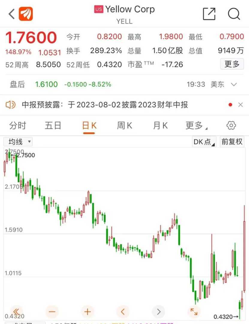 美国货车司机国际联合会对此表示遗憾,认为这是工人和美国货运业的悲伤一天。令人意外的是,Yellow公司股价在美股收盘时暴涨149%,分析人士认为可能是空头回补所致。此前,Yellow公司因遭空头大举做空,股价暴跌至0.432美元/股。