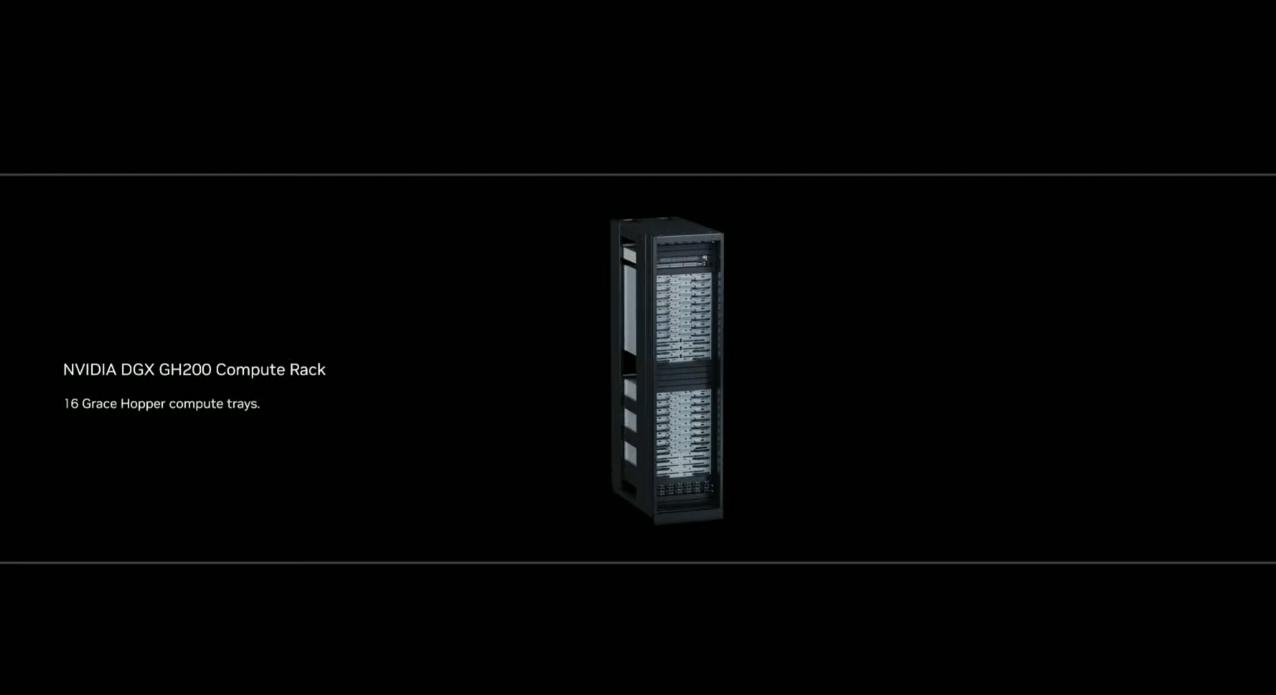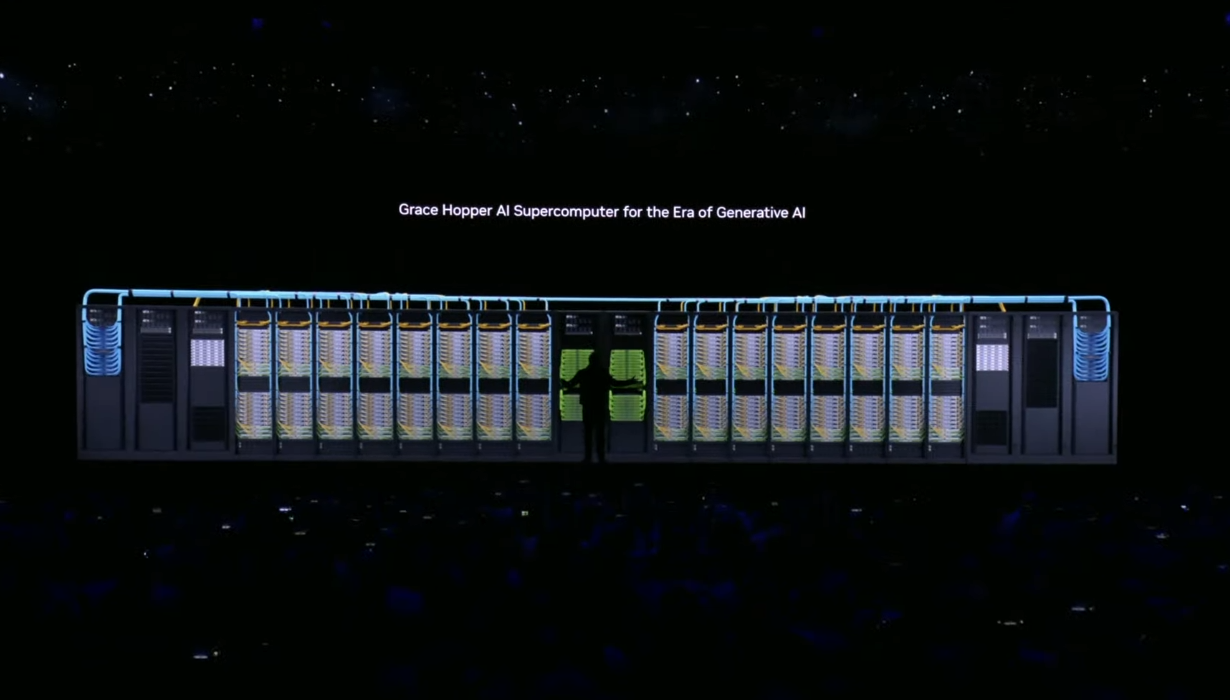 英伟达还展示了如何利用NVLink等技术构建为生成式AI打造的超级计算机系统,图片展示了系统的震撼规模。