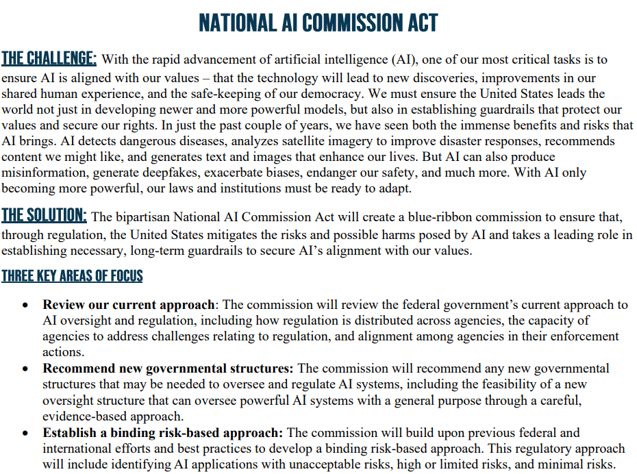 (来源:泰德·刘国会主页)法案概要显示,拟成立的“国家AI委员会”旨在通过监管减轻人工智能的风险和潜在危害,并在制定必要且长期的AI法规中发挥引领作用。