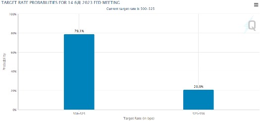 投资者目前普遍预计,在此前连续十次加息后,美联储本周料将大概率按兵不动。然而,一连串的悬念依然存在,许多人会质疑美联储本周的按兵不动,究竟只是暂时跳过6月会议,从而选择在7月再度加息;还是可能预示着其已然关上了本轮紧缩周期的大门。与此同时,目前利率期货市场定价对本月加息的概率预期依然超过了20%。虽然加息的几率整体不大,但超过两成的概率仍是不容投资者完全忽视的。
